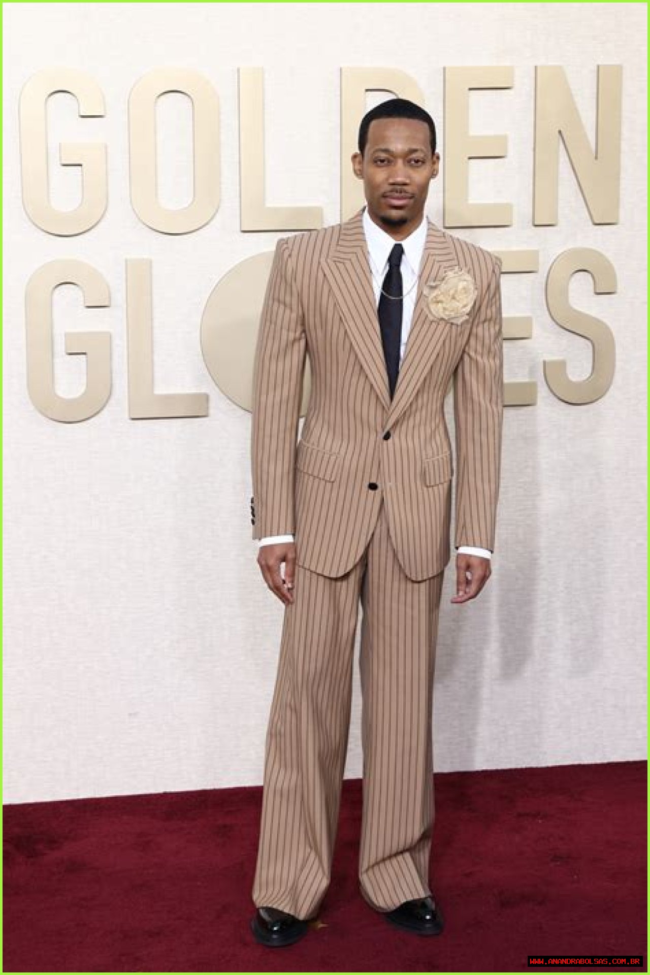 Tyler James Williams arrived on the 2024 Golden Globes red carpet in Los Angeles on Sunday wearing a light brown pinstriped suit with a statement floral boutonniere, a white shirt and a skinny black tie.